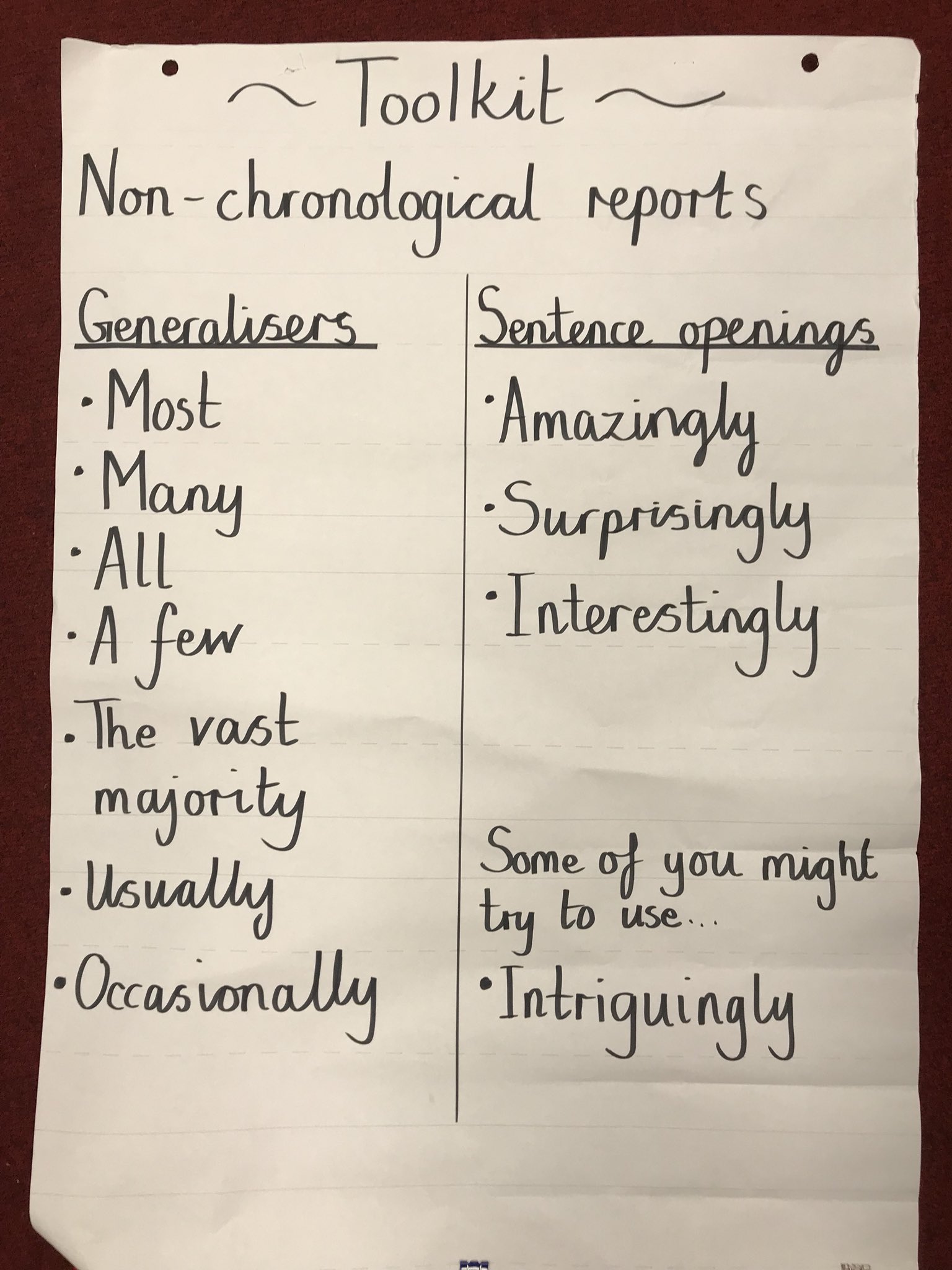 Non chronological report ks2 toolkit. ZSit down get your coat on Zclean your teeth etc are common speech patterns usually internalised before children begin school. Week 2 will involve re-writing the model text editing and publishing and then week 3 will involve them writing their own non-chronological report using the toolkit we have created for analysing the model text. This resource includes up to four different text types narrative instructions non-chronological report and letter.